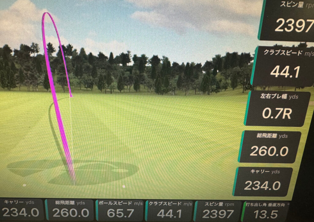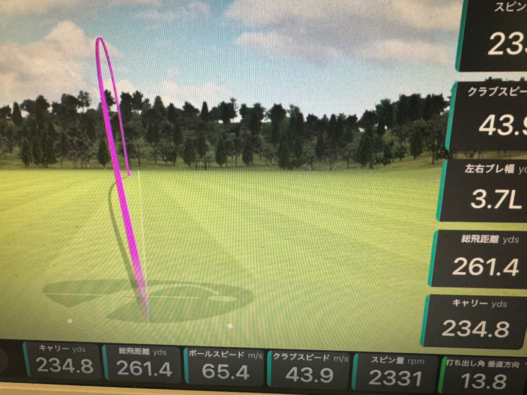 飛距離も打ち出し角もそれほど変わらない感じですね。ボールスピードはやはり慣れていないせいか少し低いような気がします。クラブスピードも出ていないですね。慣れたら早くなりそうな予感はあります。