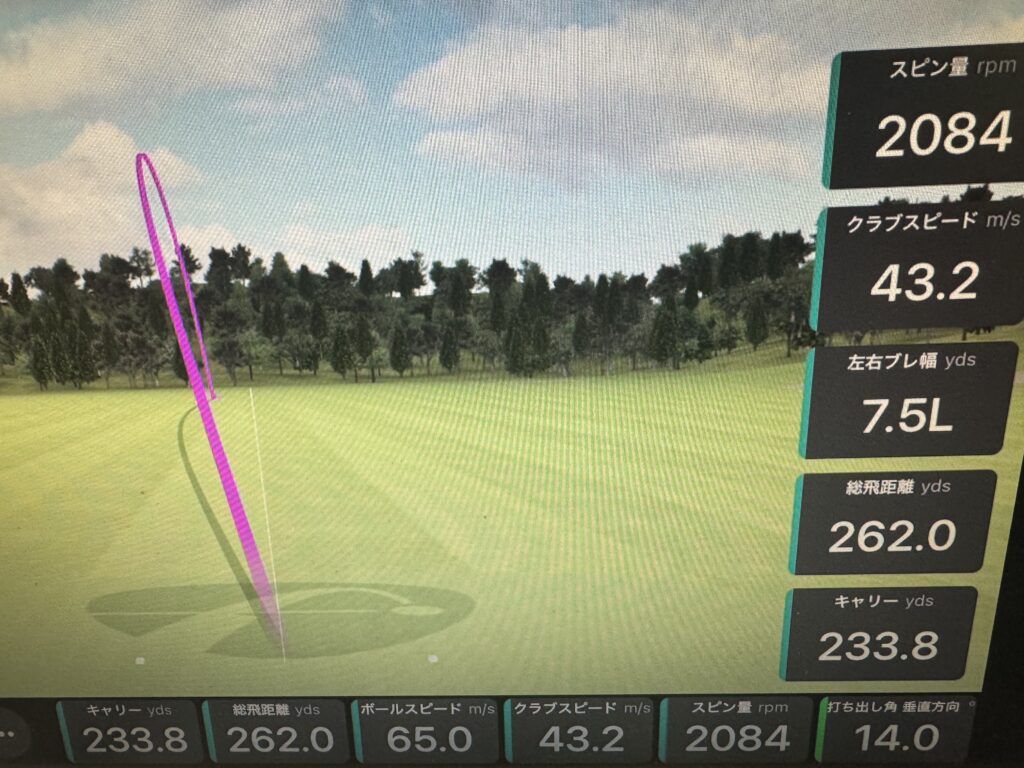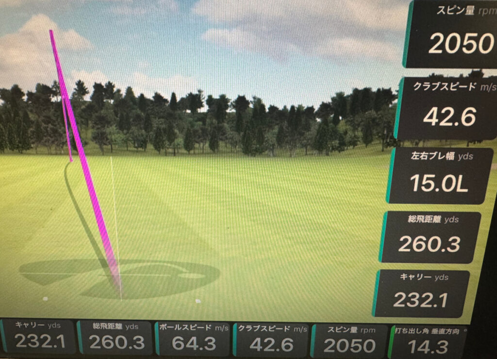 打ち出し角は14度前後、スピン量は 2000rpm 前後な感じですね。飛距離は 260 Yard 前後は飛んでいるようです。