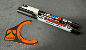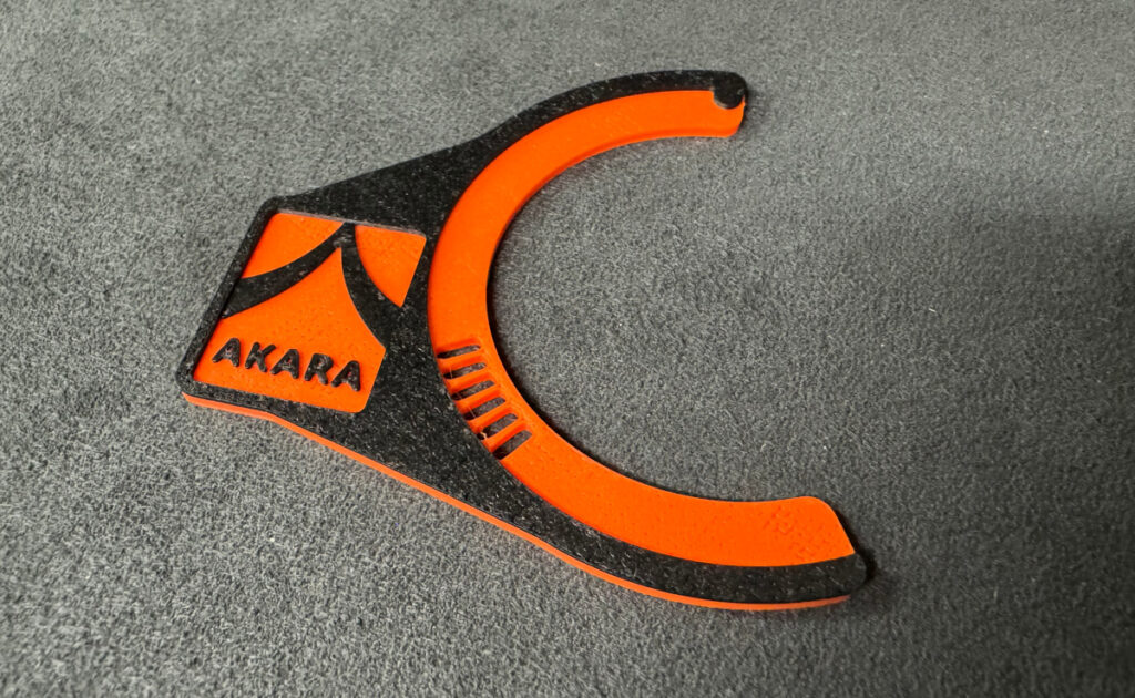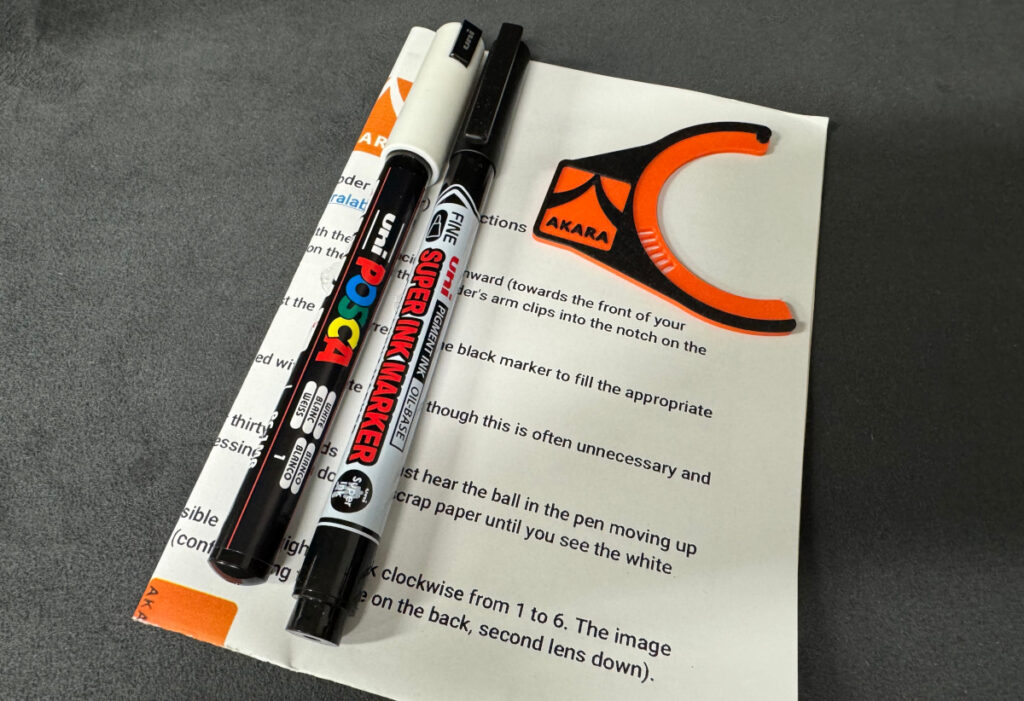 上の先端に見える突起が引っ掛かりになっていて、それをレンズのマウントのくぼみに合わせて場所を決めて、”AKARA” の文字の右に見える 6 個の窓に色を入れていく感じです。