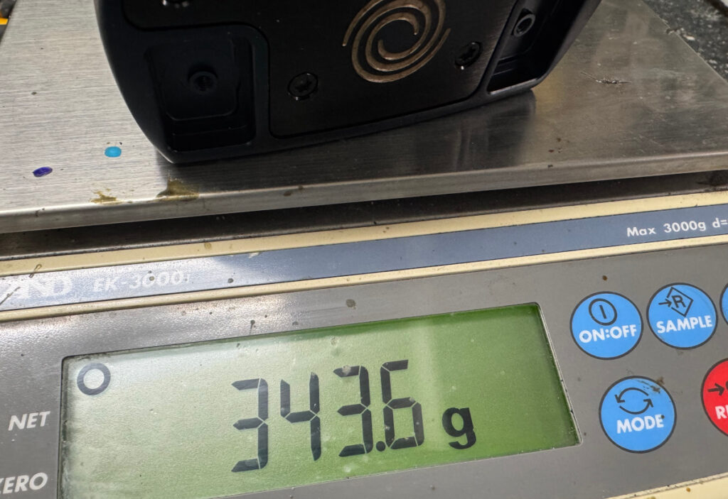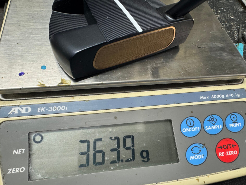 先日の記事の通りのカスタムです。まずはシャフトを外してヘッド重量を計測してみると、363.9g とやはりかなり重いヘッド重量です。