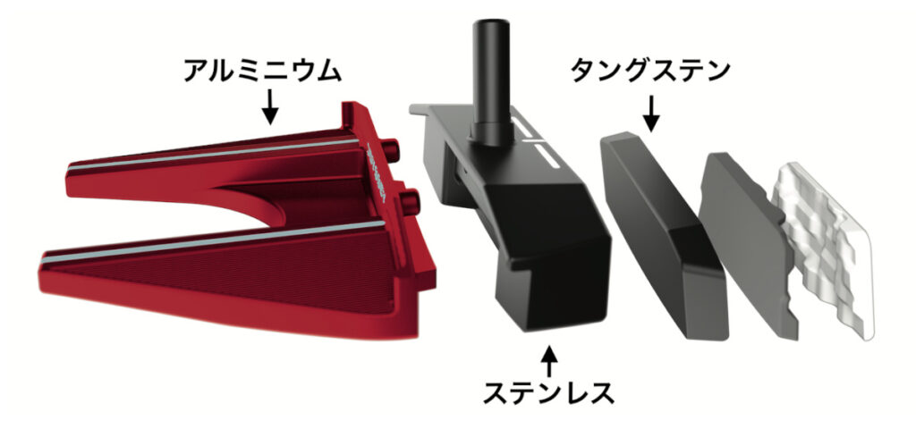 シャフトが刺さる部分はステンレス素材で、その内部にはタングステンが入ります。それに対して後方の赤い部分の素材はアルミニウムになっていて比重が軽いものになっています。