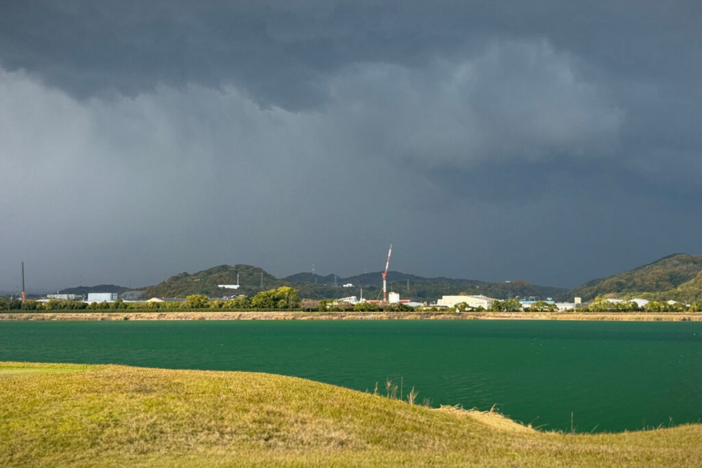 ですがここで真っ黒な雲がみるみる近づいてきて、前の組がセカンドを打つのを待っているころからぽつぽつ降ってきてしまいました。それがティショットをやっと打てるという状態になった時には強風が吹いて土砂降り…。