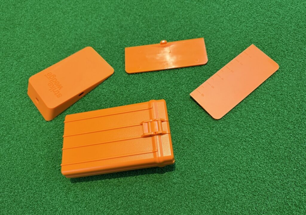 日本人が作る練習グッズにはつかないだろうな..と思うちょっと洒落たケースに入った strike wedge は、本体に加えて2枚の同素材のプレートがついています。