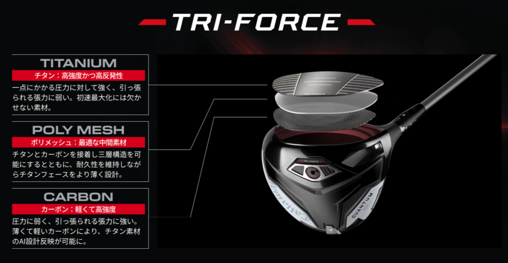 ただそれを実現させるとフェース面の耐久性に課題が残ってしまうため、それを解決するべく “TRI-FORCE(トライフォース) フェース”を新たに開発したとのことでした。