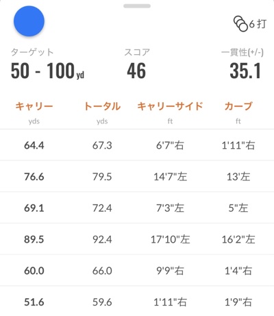 このリストはさらに右に続いていて計測したボールデータやクラブデータが記録されています。これがあるので、練習の成果を過去の自分と比較することも簡単になるわけです。