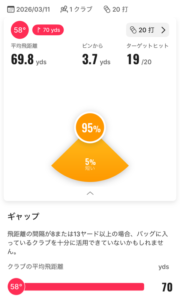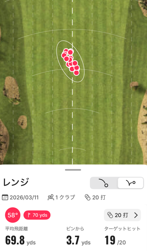 今回は「練習」メニューから「レンジ」を選択して 58 度のウェッジを力まずに打った時の練習をしてみました。