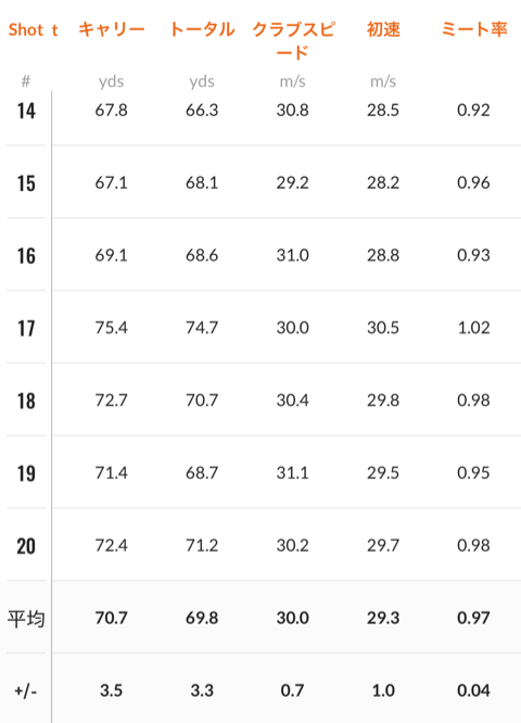 今回打ってみたのは 20 球で、飛距離の設定を 70 Yard に設定して打ってみたデータがこれです。平均飛距離は思っていた通りのほぼ 70 Yard。左に行ったボールは飛んで右に行ったボールは飛ばないという何ともわかりやすい結果になりました。