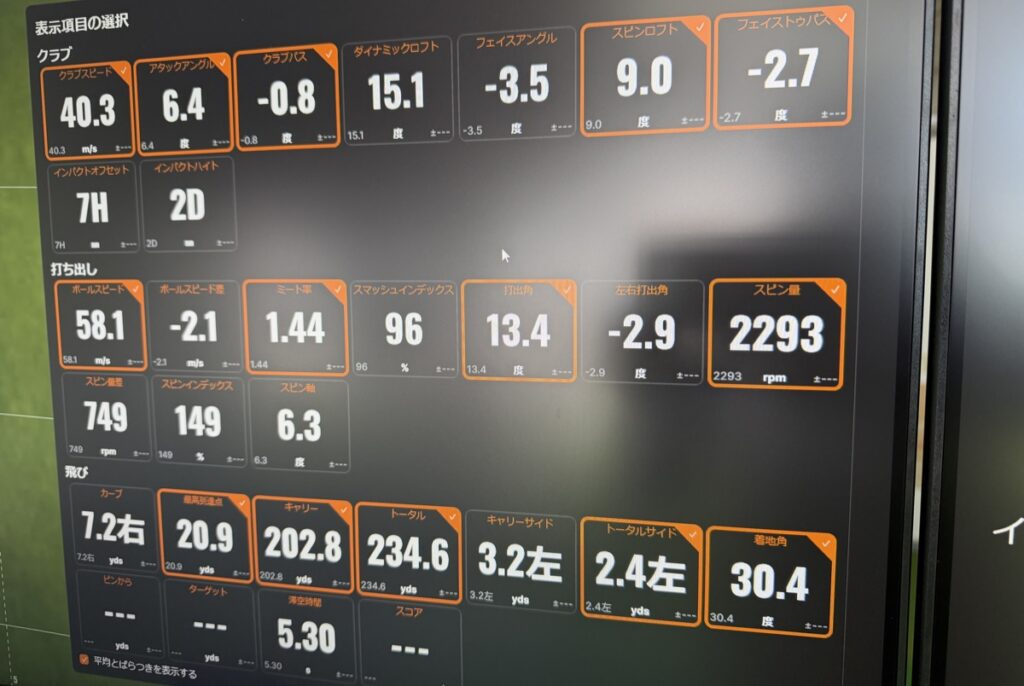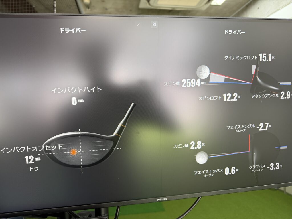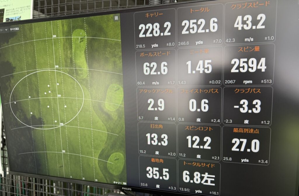 ショット分析は様々なクラブデータと弾道データが出るモードです。とりあえず一発打ってみたデータをご覧ください。