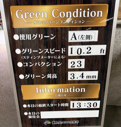 ゴルフ場の印象は手入れが行き届いた良いコースで、グリーンもそこそこ速くて(10.2ft)、硬くなっていてグリーンをキャッチした時の距離感が難しかったです。