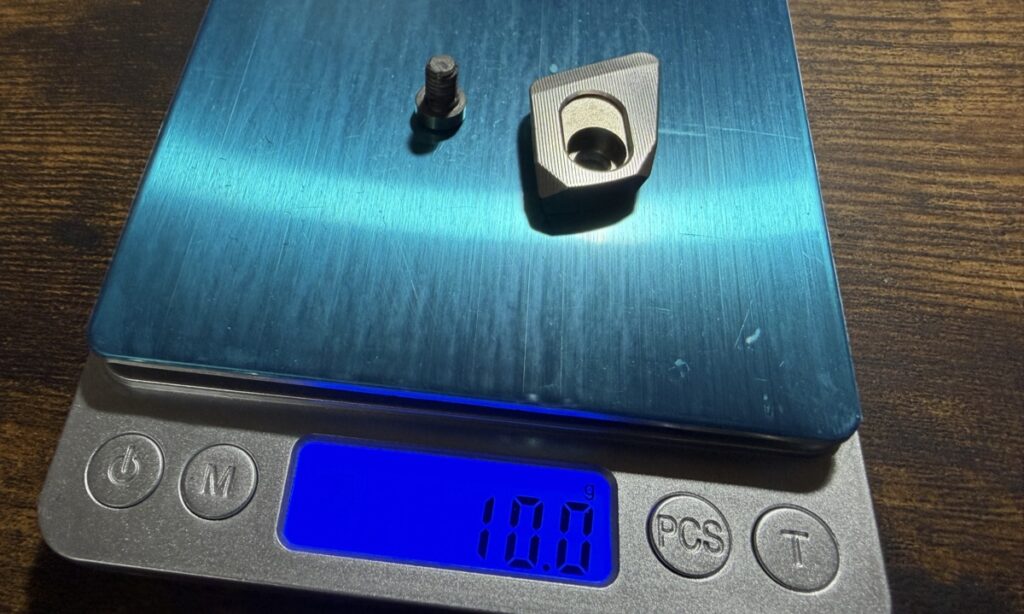 で外したネジとウェイトの重さを測ってみると合わせて 10g。別々に測ってみるとネジが 1g でウェイトが 9g でした。